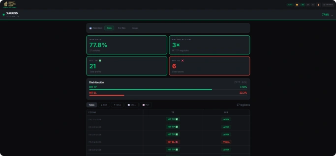 Nuestra estrategia está diseñada alrededor de un solo trade diario, priorizando precisión, control y consistencia. Actualmente, los setups rastreados muestran un 72.4% de win rate promedio.