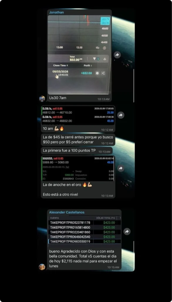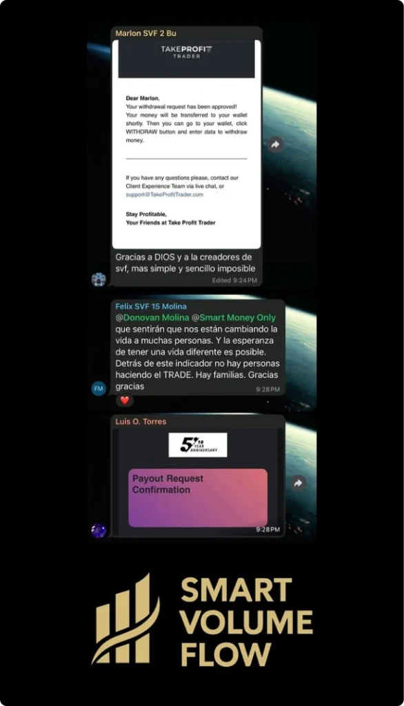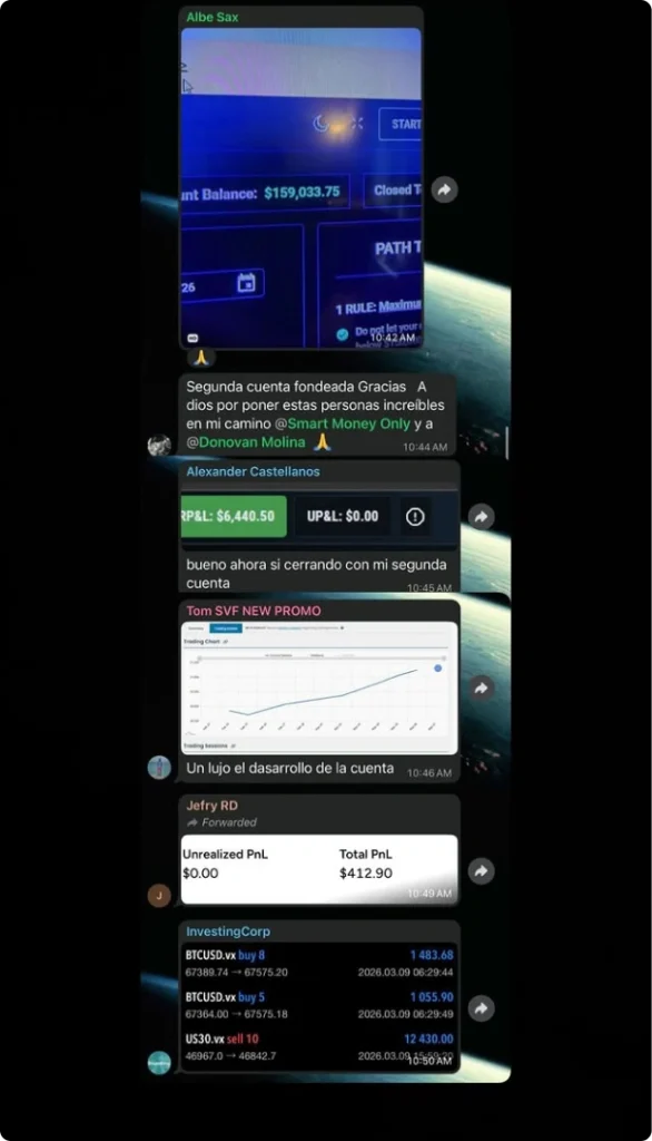 Capturas reales enviadas por miembros de la comunidad mostrando avances, progreso operativo y logros alcanzados con Smart Volume Flow dentro de su proceso de trading.